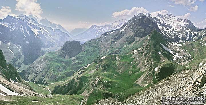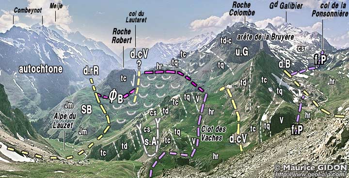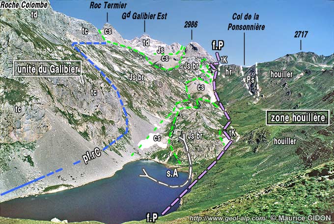 Cette limite correspond à une importante cassure, la faille de la Ponsonnière, qui sépare deux entités briançonnaises élémentaires, la zone houillère axiale et, plus à l'ouest, l'unité du Grand Galibier, qui est, à cette latitude, l'unique unité à matériel briançonnais qui soit imbriquée sur les écailles subbriançonnaises et constitue, du point de vue structural, la bordure occidentale du Briançonnais (voir à ce sujet la page "Grand Galibier" et la page d'aperçu d'ensemble sur la rive gauche de la Guisane).
