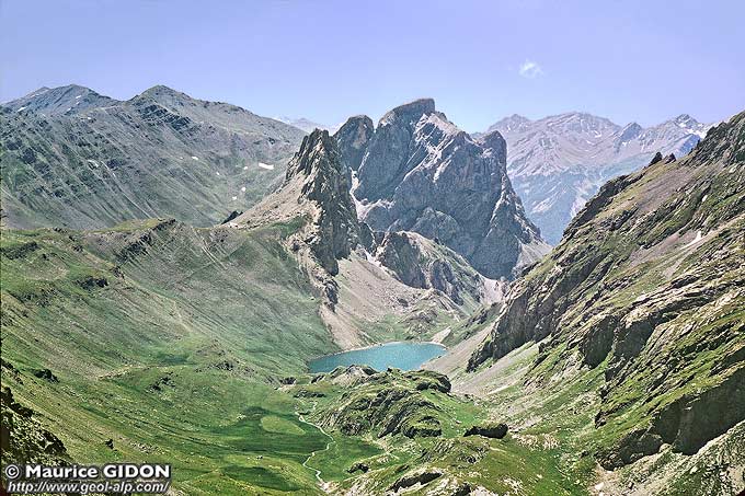 Les couches supérieures de l'unité du Grand Galibier sont rebroussées, au nord du lac par un pli déversé vers l'ouest que sa situation conduit à considérer comme le prolongement du synclinal de l'Aiguillette du Lauzet (voir la page "Lauzet") ; mais, contrairement à ce que suggère sa localisation, en bordure ouest da la faille de la Ponsonnière, ce pli ne peut pas représenter un crochon* induit par l'avancée de l'unité des Cerces car son plan axial est moins penté que la surface de cassure de la faille.