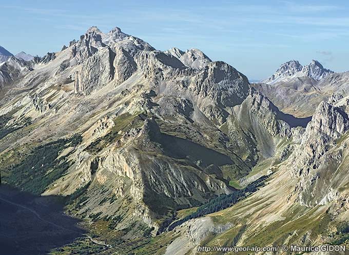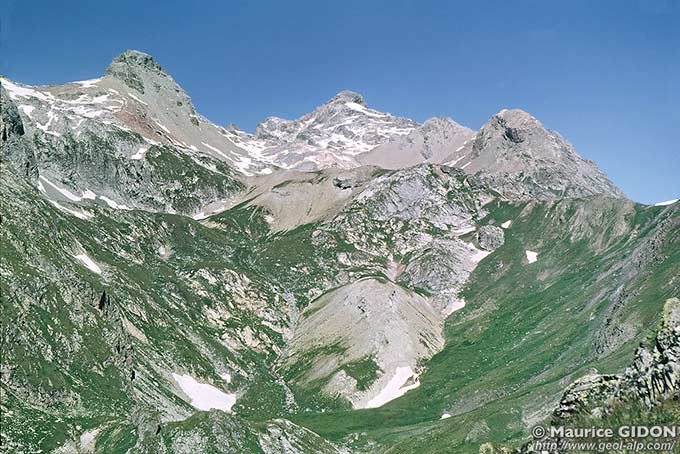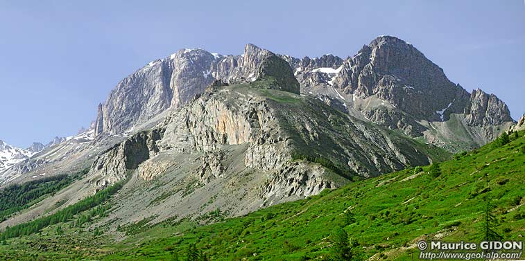 À ce propos on peut se poser la question de l'origine de la mise en saillie de ce monolithe de la Roche Robert. C'est objectivement une klippe que l'érosion a détachée de l'unité du Galibier ; mais on peut se demander si son isolement actuel ne résulte pas d'un glissement en masse l'ayant abaissé par rapport aux autres affleurements de calcaires triasiques qui sont situés plus haut sur la crête qui descend du Pic de la Ponsonnière (voir le cliché pris d'E en W, à la page "Le Lauzet"). |