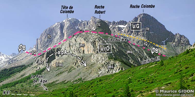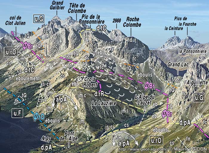 La crête rocheuse du Grand Galibier se poursuit vers le sud-est par la longue crête de la Roche Colombe et se termine finalement en dominant le versant de rive droite (septentrionale) du vallon de l'Alpe du Lauzet. Cette profonde entaille transversale, pratiquée par le torrent du Rif (le plus septentrional des affluents de rive gauche de la Guisane), donne une coupe naturelle de ce chaînon et montre en particulier, à son débouché aval, les rapports entre l'unité du Grand Galibier (la plus occidentale de la zone briançonnaise sur cette transversale) et son substratum de matériel subbriançonnais.