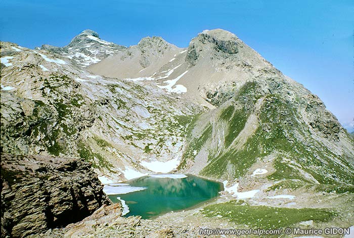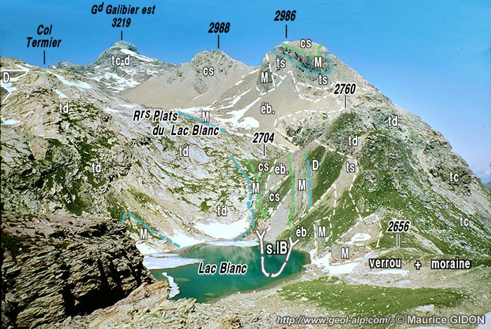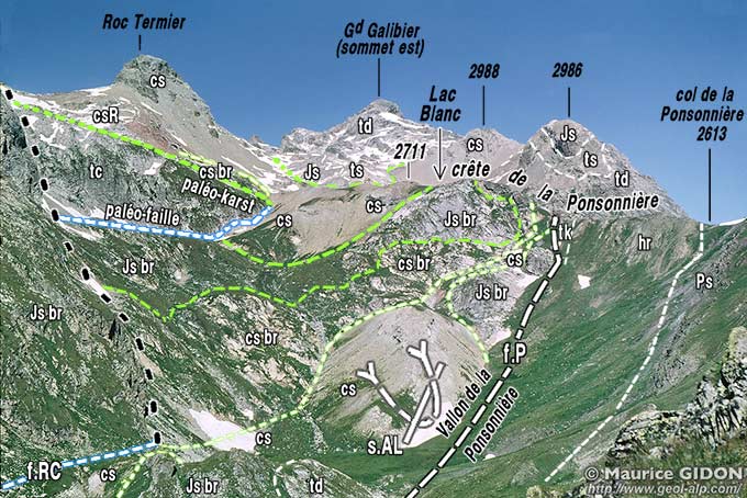 Du côté oriental et méridional la dalle rocheuse calcaire qui constitue l'unité du Grand Galibier s'enfonce globalement vers le sud-est jusqu'à buter contre la faille de La Ponsonnière. Cette cassure passe notamment 250 m à l'ouest du col de ce nom, au pied des rochers retenant le Lac Blanc . Ce dernier est un typique lac de surcreusement* retenu par un verrou* dont la localisation est due à ce que le glacier descendant du col Termier a évidé là un étroit synclinal d'axe presque N-S à cœur de calcschistes néocrétacés (il s'agit vraisemblablement du prolongement septentrional du synclinal de l'Aiguillette du Lauzet).