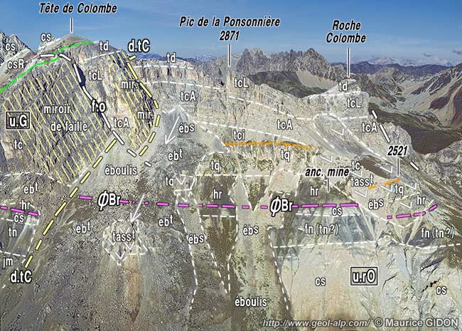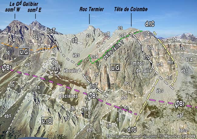 Le versant occidental du groupe rocheux de la Tête de Colombe présente des escarpements spectaculaires qui dominent la route N.91 et que l'on peit contempler avec plus de recul depuis le col du Lautaret. Sous cet angle on constate que la falaise des calcaires triasiques qui arment l'unité briançonnaise du Grand Galibier est affectée par plusieurs failles dont les caractéristiques sont diverses.