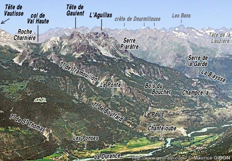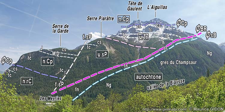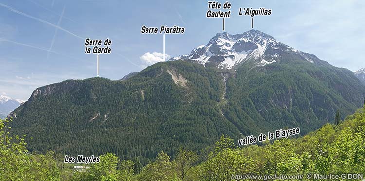 Du côté septentrional de la montagne la profonde coupe naturelle de la vallée de la Biaysse montre les rapports entre le Briançonnais et l'autochtone de couverture du massif du Pelvoux (voir la page "Dourmillouse").