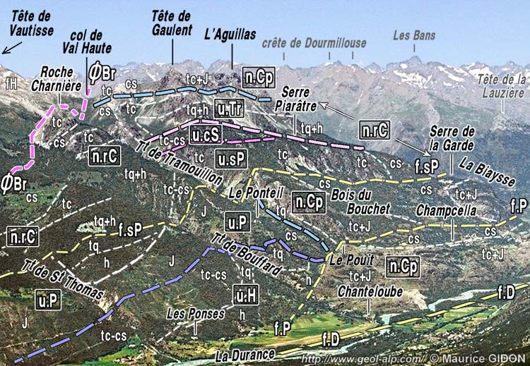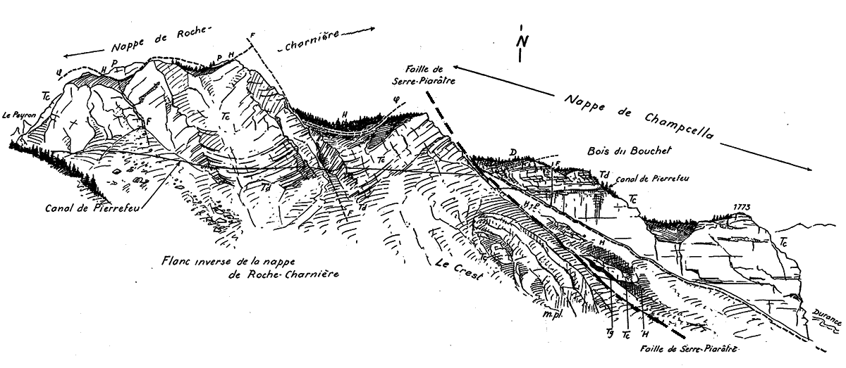 En outre ce dispositif d'écailles empilées est recoupé par un système de failles NNW-SSE, à lèvres orientales abaissées, qui le découpe en tronçons successifs décalés en escalier descendant vers la vallée de la Durance. La plus importante est la faille de Serre Piarâtre, qui effondre suffisamment ce dispositif pour que le matériel de la nappe de Champcella affleure dans les basses pentes du Bois du Bouchet et du Serre de la Garde, en contrebas est des escarpements de Clot La Selle et de Serre Piarâtre, alors que ces derniers appartiennent pourtant à l'unité "inférieure", de Roche Charnière.