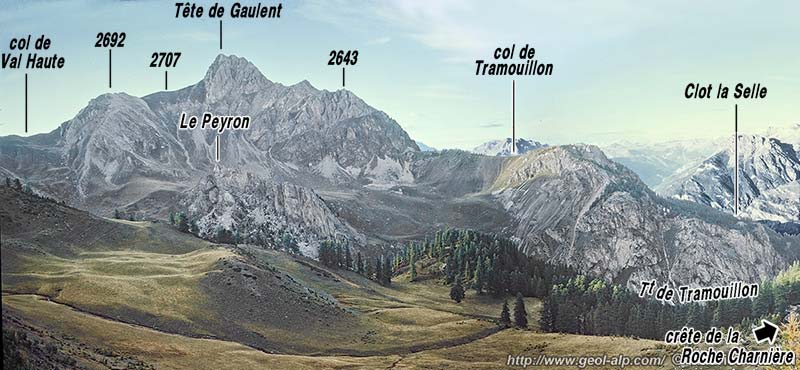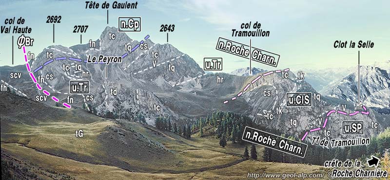 ![]() Le versant occidental du chaînon de Gaulent, vu de l'ouest depuis le sommet du Piquet. ØBr = chevauchement frontal du Briançonnais ; n.P = nappe du Parpaillon (flysch à Helminthoïdes) : noter la terminaison de ses affleurements vers la gauche, où ils sont coupés en biseau par le front briançonnais ; SB = zone subbriançonnaise, réduite à une lame de flysch noir. commentaires complémentaires à la page "Couleau - Vautisse" |