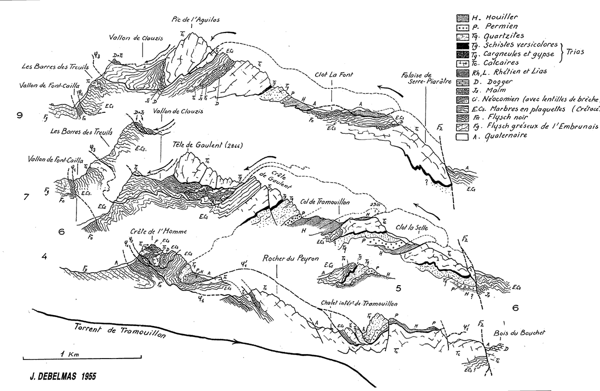 ![]() Coupes SW-NE, transversales à la crête de Gaulent (extrait de J.DEBELMAS 1955a, pl.IV ; coupes suivantes vers le sud en page "Roche Charnière") Les unités imbriquées rattachées à la nappe de Roche Charnière sont reployées en un pli couché dont la charnière est visible dans les pentes entre la Tête de Gaulent et le Rocher du Peyron. F2 = faille extensive de Serre Piarâtre. |
