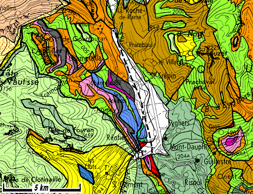 Il est particulièrement clair ici que le "front briançonnais" ne peut pas être considéré comme la surface de charriage originelle des nappes briançonnaises : c'est un accident tardif par rapport à ce charriage puisqu'il en reoupe l'empilement d'unités. S'il a amené les nappes briançonnaises à reposer sur l'autochtone c'est par l'effet d'un cisaillement au niveau élevé de la structure, qui a déformé cet accident sub-vertical dans ses parties profondes (voir la coupe de Réotier) en le déversant vers l'ouest. Cette manière de voir interroge quant à la signification de la grande charnière synclinale de Saint-Clément - Meyronnes : il est séduisant de penser qu'elle ne représente que le crochon induit, au niveau des nappes de l'Embrunais par ce cisaillement proverse tardif. |