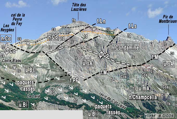 L'abrupt sommital de la Tête des Lauzières se montre formé de deux tranches superposées de calcaires et dolomies du Trias moyen. Si l'unité supérieure appartient très clairement à la nappe de la Condamine, il est par contre difficile de savoir ce que représente l'unité inférieure.