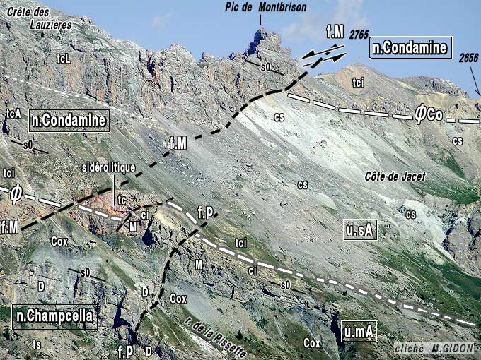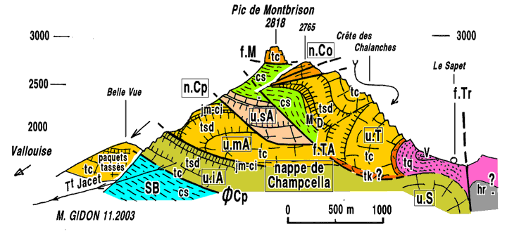 ![]() Coupe du chaînon de Montbrison, à la latitude du Pic de Montbrison Légende des couleurs comme pour la carte d'ensemble (pas de distinction lithologique au sein du subbriançonnais, nuances de beiges pour les carbonates triasico-jurassiques des unités briançonnaises). n.Co = nappe de la Condamine (corps principal) ; n.Cp = nappe de Champcella (subdivisée en 2 ou 3 unités) ; u.sA = unité supérieure de la Tête d'Aval ; u.mA = unité moyenne de la Tête d'Aval (nappe de Champcella proprement dite) = (?) u.T = unité des Tenailles ; u.iA = unité inférieure de la Tête d'Aval = (?) u.S = unité de La Salcette (unité inférieure de la nappe de Champcella) ; u.B = unité de Bouchier (nappe de Roche Charnière) ; SB = unités subbriançonnaises. f.TA = faille de la Tête d'Amont ; f.Tr = faille de Trancoulette. |