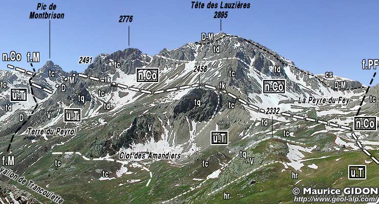 ![]() La Crête de la Lauzière vue de l'ouest, depuis les pentes de rive droite de la Vallouise (Pra Vieil, 2 km au NW de Puy Aillaud) (suite du paysage vers la gauche à la page "Condamine"). n.Co = nappe de la Condamine (corps principal) ; u.sA = unité supérieure de la Tête d'Aval (?), se prolongeant sans doute vers le nord par u.Bs = unité supérieure du Bas Morand ; u.mA = unité moyenne de la Tête d'Aval (nappe de Champcella), se prolongeant sans doute vers le nord par u.Bi = unité inférieure du Bas Morand. La grande largeur de la zone de paquets glissés de Coste Blaou - Le Lavé ne permet pas de suivre avec certitude la continuité des unités qu'elle affecte. La plupart de failles qui recoupent l''empilement des nappes ont un rejet essentiellement extensif : fPF = faille de la Peyre du Fey (NE-SW) : sa lèvre droite est abaissée, mais son jeu a vraisemblablement dû comporter une composante notable de mouvement décrochant ; fLn = faille septentrionale des Lauzières ; fLs = faille méridionale des Lauzières ; f.M = faille du Montbrison (ces trois failles NW-SE ont au contraire leur lèvre gauche est abaissée). |