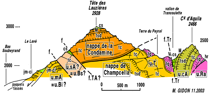 ![]() Coupe du chaînon de Montbrison, à la latitude de la Tête des Lauzières Légende des couleurs comme pour la carte d'ensemble (pas de distinction lithologique au sein du subbriançonnais, nuances de beiges pour les carbonates triasico-jurassiques des unités briançonnaises). n.Co = nappe de la Condamine (corps principal) ; u.sA = unité supérieure de la Tête d'Aval (plus au nord = unité du Bas Morand u.BM) ; u.mA = unité moyenne de la Tête d'Aval (nappe de Champcella proprement dite) (plus au nord = unité de Coste Blaou u.CB) ; u.T = unité des Tenailles ; u.cA = unité de la crête d'Aquila = (?) unité de La Salcette ; u.Ra = unité de Ratière (nappe de Roche Charnière ?). f.TA ? = prolongement septentrional hypothétique de la faille de la Tête d'Amont ; f.Tr = faille de Trancoulette. |