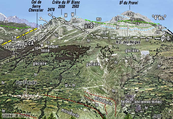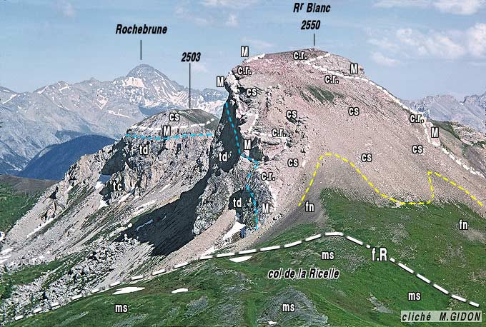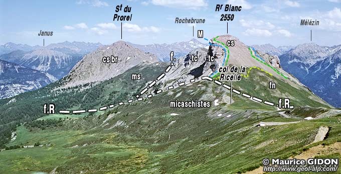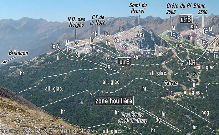 ![]() La Crête du Rocher Blanc vue du nord-ouest, depuis le sommet de Serre Chevalier f.R = faille de la Ricelle (prolongement vraisemblable, à l'est de la faille de Trancoulette de celle du col de la Pisse (voir page "Serre Chevalier") ; cs-Mbr = brèches du Prorel. |