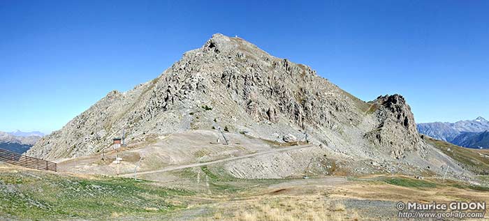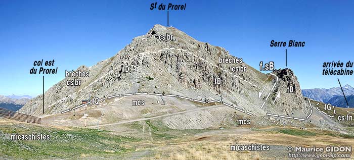 2 - sa pyramide sommitale, qui affecte la forme d'un cône, semble être posée en chapeau sur les termes les plus élevés (flysch noir) de la succession de la nappe de la Condamine : cette "unité de Prorel" est donc une sorte de butte témoin, isolée par l'érosion, d'un ensemble qui recouvrait cette nappe mais dont il ne reste rien tout autour.