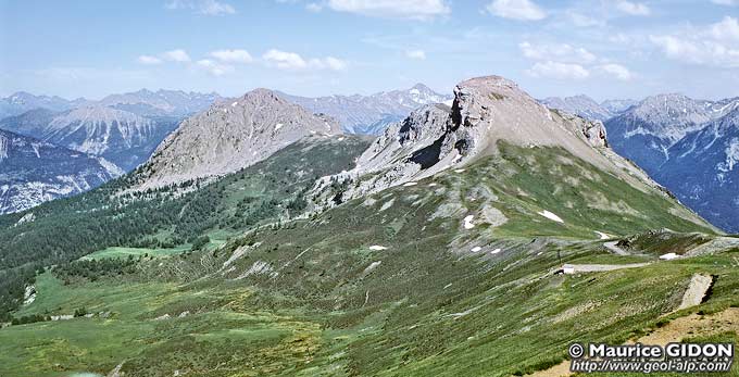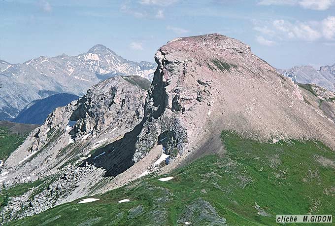 3 - ces escarpements sommitaux sont presque entièrement formés de brèches, épaisses de plus de 200 m. Ces brèches du Prorel sont grossières et formées d'éléments anguleux dont la taille excéde le plus souvent la dizaine de centimètres, voire le mètre. Leur matériel, très polygénique, est essentiellement constitué de calcaires et dolomies triasiques mais elles se singularisent par rapport aux nombreuses autres brèches du Briançonnais par la présence, assez fréquente à certains niveaux, d'éléments siliceux (quartzites triasiques et Verrucano).