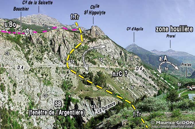 ![]() Les basses pentes du massif de Montbrison, vues du sud-est depuis les pentes de rive gauche de la Durance (abords du hameau de Truel). La Durance passe en gorge entre les rochers de la chapelle Saint-Hippolyte et le "Château" de Queyrières. u.S = unité briançonnaise de La Salcette ; u.Bo = unité briançonnaise basale de Bouchier (rapportée à la nappe de Roche Charnière) ; ØBr = chevauchement briançonnais basal ; f.Tr = faille de Trancoulette ; f.P = faille prolongeant probablement celle de Piolier (voir la page "Prelles"). La surface de chevauchement de la zone briançonnaise est interprétée comme tranchée et abaissée à l'est de la faille de Trancoulette, (qui est elle même décalée en sens sénestre par la faille de Piolier). |
