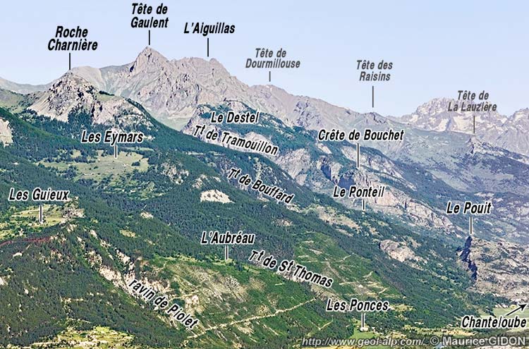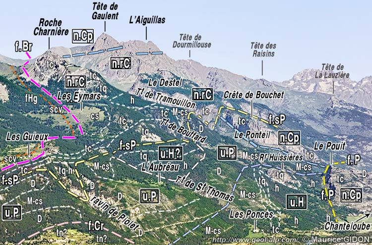 Il faut toutefois remarquer que la surface du front briançonnais ne représente pas celle du charriage de la nappe de Roche Charnière mais une cassure plus tardive : en effet plus au nord, à la Tête de Gaulent, il met en contact les flysch de l'Embrunais avec la nappe, immédiatement plus élevée, de Champcella. |