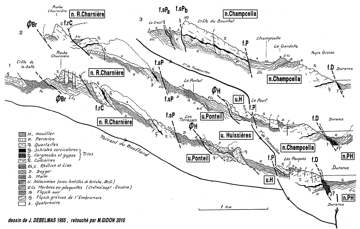 ![]() Coupes des pentes de rive droite de la Durance à la latitude de Chanteloube (extrait de J.DEBELMAS 1955a, pl.IV) La coupe 1, orientée W-E, suit la rive gauche du torrent du Bouffard et les coupes 2 et 3, orientées plus SW-NE, suivent respectivement la rive droite et gauche du torrent de Tramouillon. ØBr = accident du front du Briançonnais ; ØCp = surface de chevauchement de la nappe de Champcella ; f.rC = faille de Roche Charnière ; f.sP = faille de Serre Piarâtre (a = branche W, b = branche E) ; f.P = faille du Pouit ; f.D = faille de la Durance. coupes suivantes, vers le nord, en page "Tête de Gaulent") |