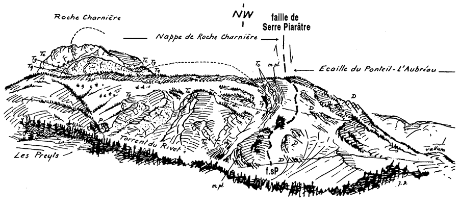 ![]() Les pentes de rive gauche du torrent de Bouffard, vues du SE, depuis les Preyts (extrait de J.DEBELMAS 1955a, fig.21). (m.pl. = marbres en plaquettes néocrétacés-éocènes). f.sP = prolongement de la faille de Serre Piarâtre : son rejet (abaissement de sa lèvre orientale) détermine le crochon tordu vers le bas qui affecte sa lèvre occidentale, constituée par le flanc normal de la nappe de Roche Charnière (interprétation de M. Gidon, 2011) |