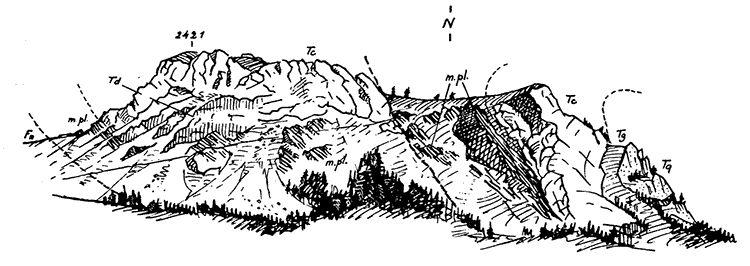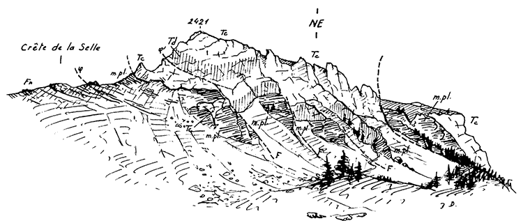 ![]() Le versant méridional de la Roche Charnière, vu du sud depuis la route forestière de Bouffard (extrait de J.DEBELMAS 1955a, fig.22a) (m.pl. = marbres en plaquettes néocrétacés-éocènes) |