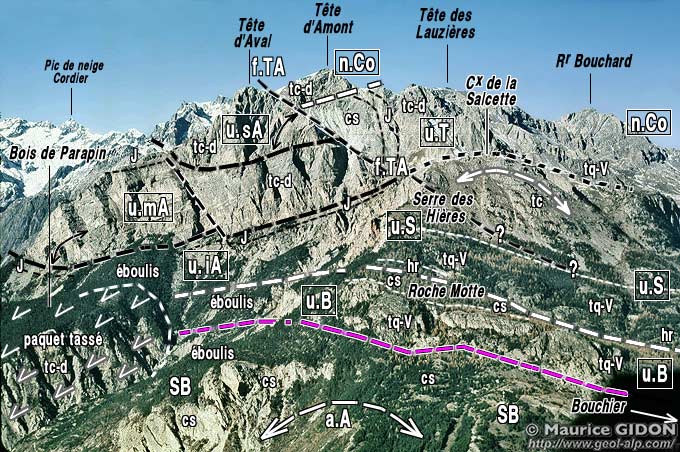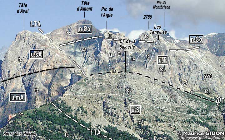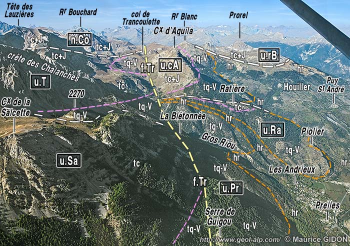 ![]() Coupe de l'extrémité sud du chaînon de Montbrison, à la latitude de la Tête d'Aval Légende des couleurs comme pour la carte d'ensemble (pas de distinction lithologique au sein du subbriançonnais, nuances de beiges pour les carbonates triasico-jurassiques des unités briançonnaises). n.Co = nappe de la Condamine (corps principal) ; n.Cp = nappe de Champcella (subdivisée en 2 ou 3 unités) ; u.sA = unité supérieure de la Tête d'Aval ; u.mA = unité moyenne de la Tête d'Aval (nappe de Champcella proprement dite) = (?) u.T = unité des Tenailles ; u.iA = unité inférieure de la Tête d'Aval = (?) u.S = unité de La Salcette (unité inférieure de la nappe de Champcella) ; u.B = unité de Bouchier (nappe de Roche Charnière) ; SB = unités subbriançonnaises. f.TA = faille de la Tête d'Aval ; f.Tr = faille de Trancoulette |