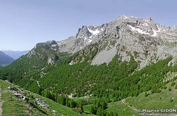 Plus bas le glacis est tranché par une barrière de falaises qui montrent le soubassement des marbres en plaquettes, formé par trois unités imbriquées, les unités supérieure, moyenne et inférieure de la Tête d'Aval. Leur succession stratigraphique conduit à les attribuer sans ambiguité à la nappe de Champcella. Les couches post-triasiques de l'unité supérieure affleurent mal dans ce secteur car cette unité est tranchée par la faille N-S de la Tête d'Aval (voir la page Salcette).