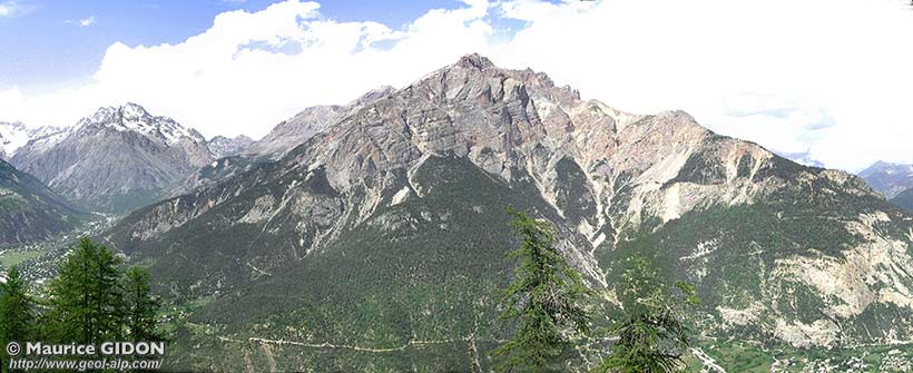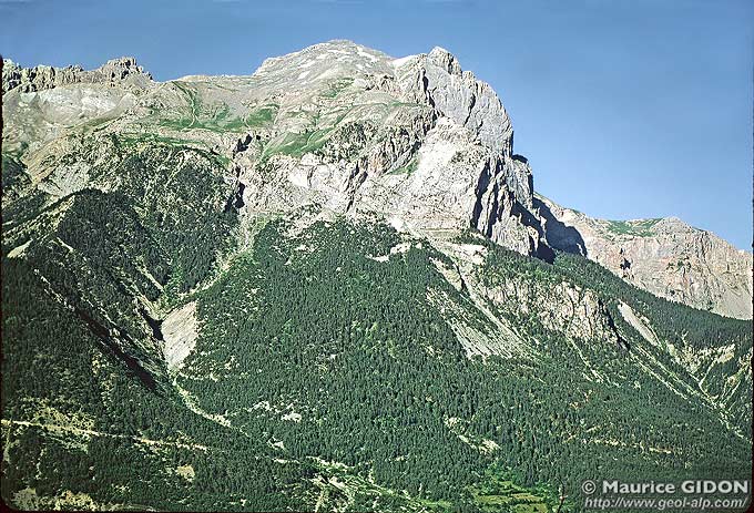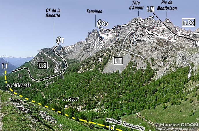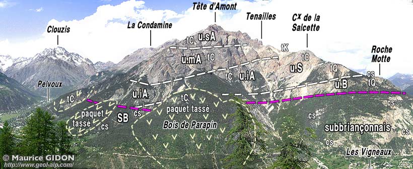 ![]() Les abrupts de la Tête d'Amont, vus du sud depuis le versant nord de la montagne des Têtes. Les tirets pourpres correspondent à la surface basale de chevauchement des unités briançonnaises (sur les unités subbriançonnaises) ; légende des notations identique à celle du schéma ci-dessous) Détails complémentaires d'interprétation à la page "Salcette" |
