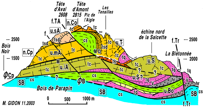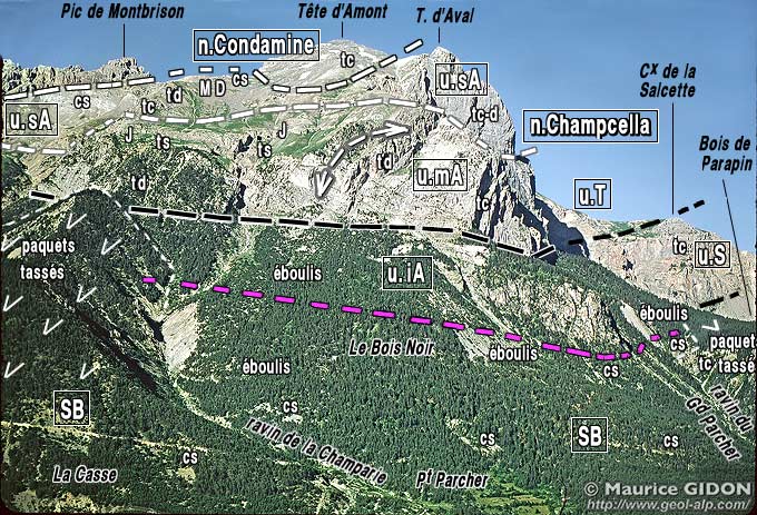 ![]() Coupe du chaînon de Montbrison, à la latitude du Pic de Montbrison Légende des couleurs comme pour la carte d'ensemble (pas de distinction lithologique au sein du subbriançonnais, nuances de beiges pour les carbonates triasico-jurassiques des unités briançonnaises) n.Co = nappe de la Condamine (corps principal) ; n.Cp = nappe de Champcella (subdivisée en 2 ou 3 unités) ; u.sA = unité supérieure de la Tête d'Aval ; u.mA = unité moyenne de la Tête d'Aval (nappe de Champcella proprement dite) = (?) u.T = unité des Tenailles ; u.iA = unité inférieure de la Tête d'Aval = (?) u.S = unité de La Salcette (unité inférieure de la nappe de Champcella) ; u.B = unité de Bouchier (nappe de Roche Charnière) ; SB = unités subbriançonnaises. f.TA = faille de la Tête d'Amont ; f.Tr = faille de Trancoulette. |