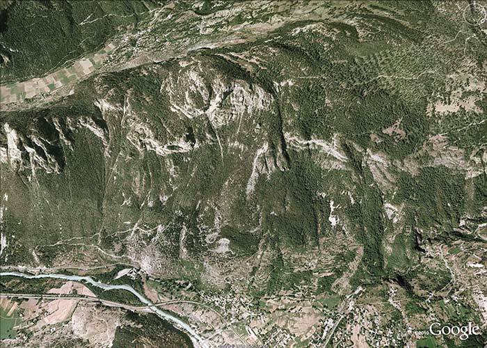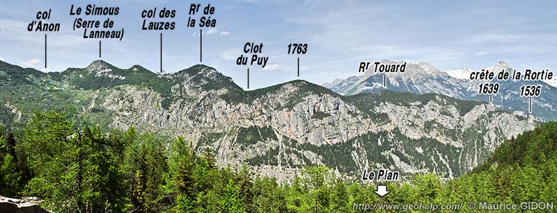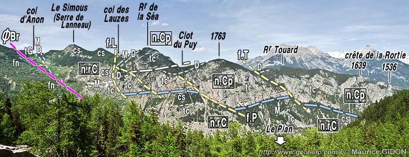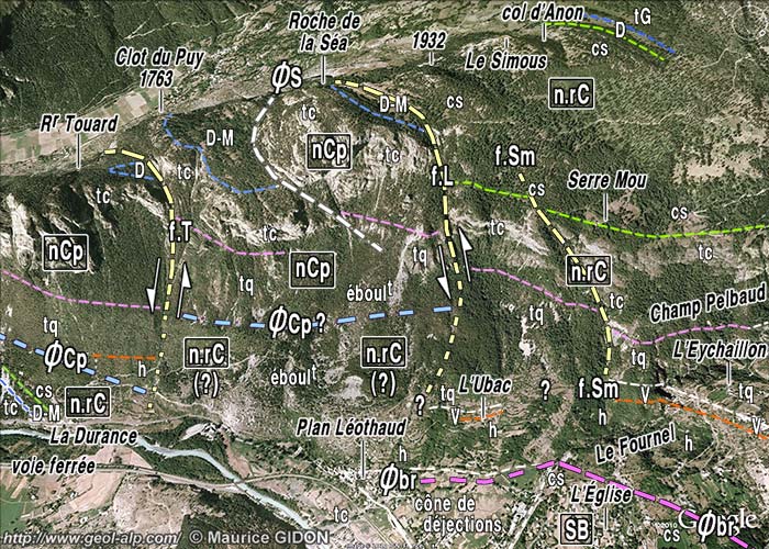 ![]() d'après une image extraite de "google-earth" Le versant nord-oriental de la crête de la Séa, en vue plongeante depuis le N-NE. Øbr (en rose) = surface de contact tectonique entre les unités briançonnaises et subbriançonnaises. n.rC = nappe de Roche Charnière ; n.Cp = nappe de Champcella ; ØS = chevauchement (accessoire) de la Séa. f.T = faille du Rocher Touard ; f.L = faille du col des Lauzes ; f.Sm = faille du Serre Mou. N.B. Les pentes de rive droite du Fournel sont considérées ici comme appartenant à la nappe de Roche Charnière (contrairement aux attributions anciennes), en accord avec les données fournies par le versant opposé (vallée de la Biaysse). |