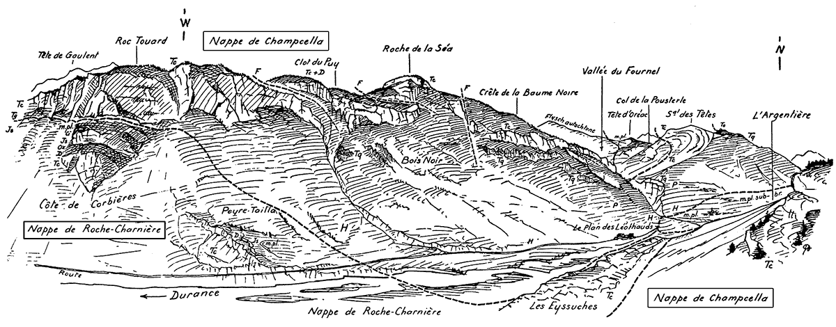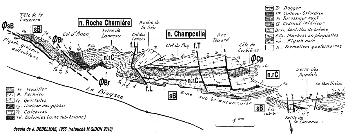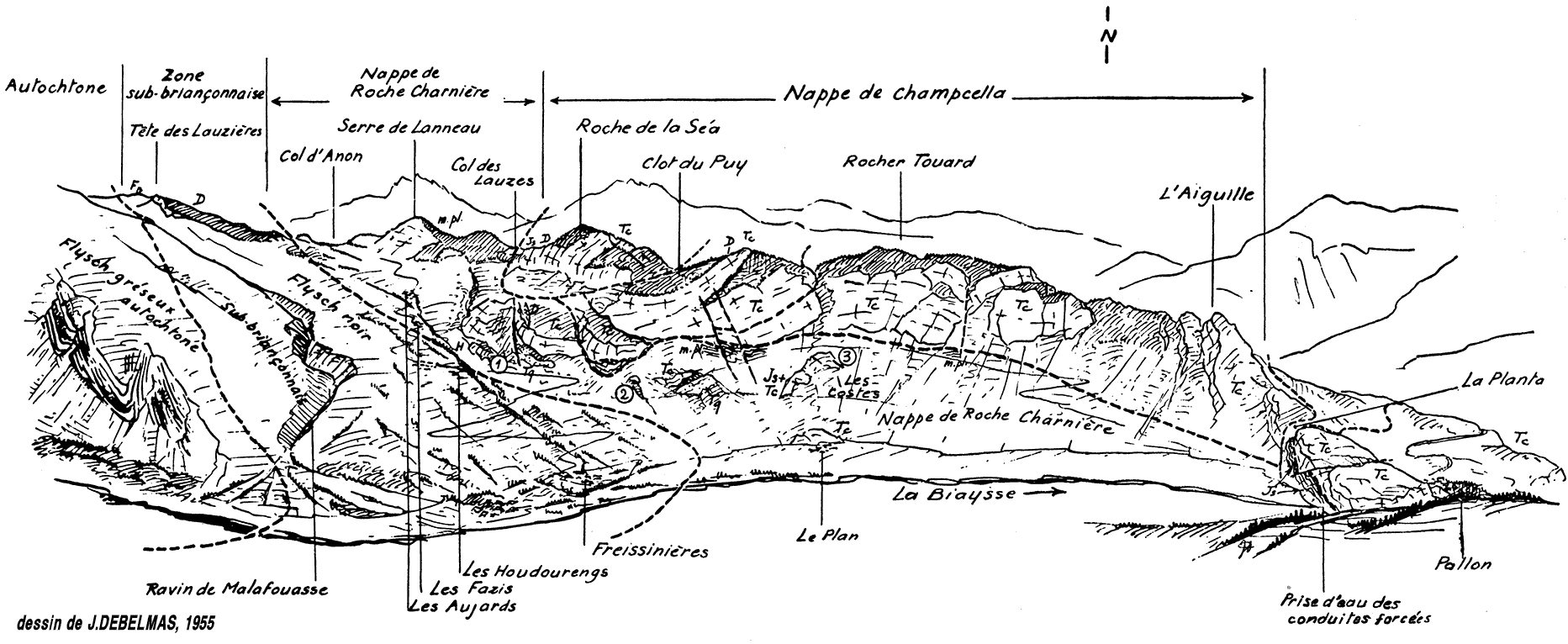 La coupe de la vallée de la Biaysse montre que la nappe de Roche Charnière se poursuit vers le NW sous la Roche de la Séa, puis forme à elle seule la totalité du matériel briançonnais affleurant au delà de la faille du col des Lauzes : cela a pour conséquence que, sur le versant Durance de la crête, les terrains permo-triasiques qui affleurent au nord de cette faille doivent être rapportés aussi au soubassement de la nappe de Roche Charnière (alors qu'ils avaient été attribués à la nappe de Champcella), ce qui s'accorde d'ailleurs avec les caractères de réduction de la succession jurassique de ces affleurements. Cette conclusion s'étend, en rive gauche du Fournel, jusqu'au matériel constitutif du signal des Têtes (ce qui en rend d'ailleurs la compréhension structurale plus facile). |