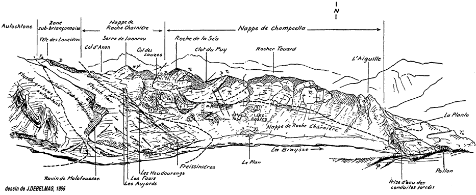![]() La rive droite de la Biaysse au nord de Freissinières (extrait de J.DEBELMAS 1955a, fig.26). |