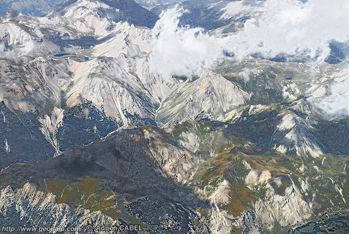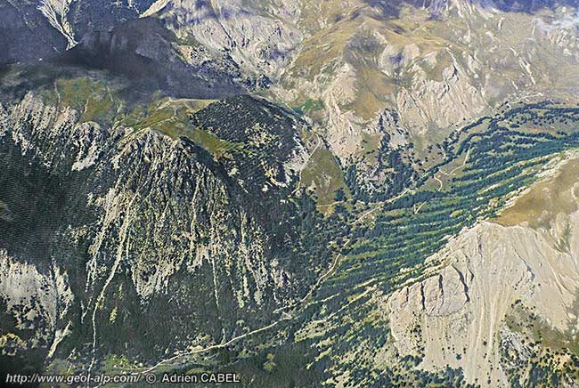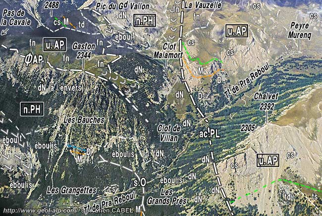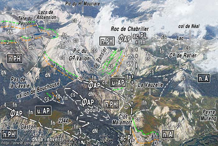 ![]() Les basses pentes du Pic du Grand vallon et le vallon supérieur de Pra Reboul, vus du sud d'avion (cliché original obligeamment communiqué par M. Adrien Cabel) n.PH = nappe de Peyre Haute ; ØAP = surface de chevauchement des "marbres en plaquettes" et du flysch noir (unité "de l'Agnelil-Patégou") sur le Trias supérieur (dN) de la nappe de Peyre Haute, en succession renversée ; u.AP = unité de l'Agnelil - Pategou ; ac.PL = accident Pansier-Lauzet ; s.O = charnière du pli-couché des Ourgières (voir la page "Catinat"). suite vers le haut au cliché précédent ... |