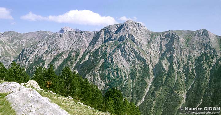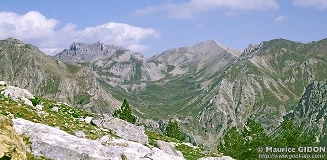 Le chaînon qui sépare les vallons de Bouchouse et de Pra Reboul se détache, vers l'ouest, de la ligne de partage des eaux entre Guil et Durance au Pic des Esparges Fines. Après une culmination à 2581 au Pic du Grand Vallon (anciennement désigné du nom de Grand Serre de la Cavale) il s'abaisse, par l'Alp Gaston, en direction de la Roche-de-Rame. Il donne une coupe transversale (E-W) de cette partie centrale du massif et montre notamment les rapports entre la nappe de Peyre Haute, qui forme son versant occidental, et celle d'Assan à laquelle se rattachent ses crêtes orientales.