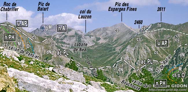 À l'est de l'accident Pansier-Lauzet affleurent uniquement des "marbres en plaquettes" néocrétacés ou du flysch noir, généralement en position à l'endroit. Mais au Roc de Chabriller, et plus encore au Pic du Grand Vallon, ces couches débordent vers l'ouest par rapport au tracé de la cassure et viennent reposer sur les dolomies noriennes renversées de la nappe de Peyre Haute. Cette disposition avait été interprétée comme le résultat du charriage d'une unité de l'Agnelil-Patégou.