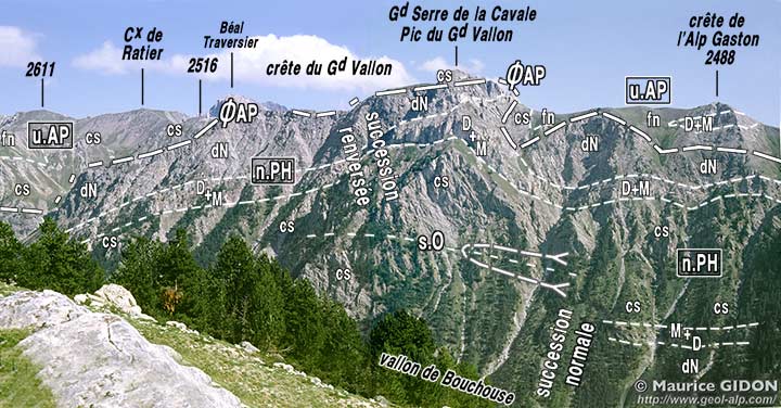 en biseau du sud vers le nord, ce qui aboutit au nord du Roc de Chabriller à la suppression complète des puissantes dolomies noriennes (mais ces couches reprennent de l'épaisseur plus au nord, au Pic de Maravoise).
