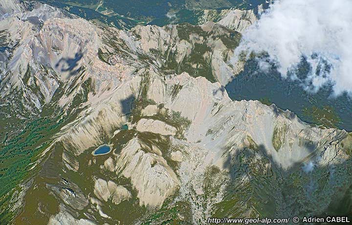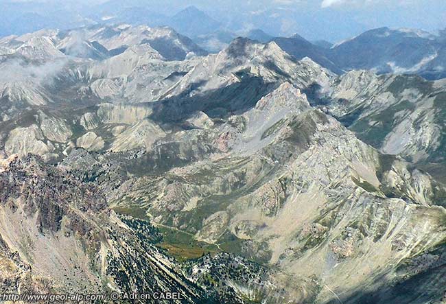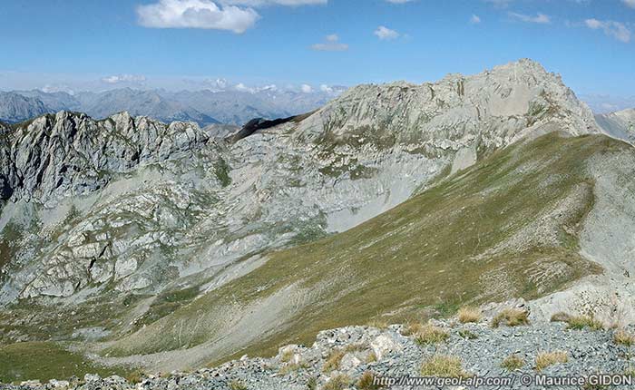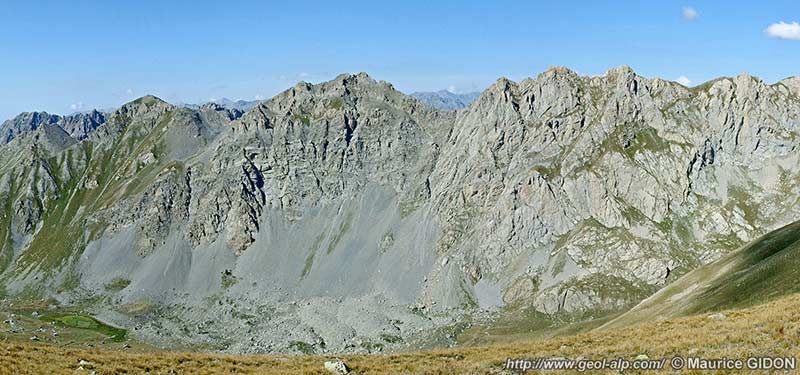 Le repli anticlinal dont le cœur de Dogger arme la crête des Chalanches correspond en arrière-plan à celui de la crête du Vaccivier. Les autres replis visibles sur l'arête qui descendu Béal Traversier vers le Pré Talmont s'enfoncent vers l'avant plan sous les "marbres en plaquettes" néocrétacés de la Crête de Pategou et restent masqué sous ces terrains dans le cirque des lacs du Lauzet.