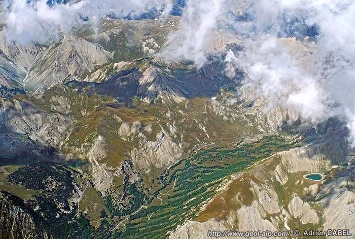 Le haut vallon de Pra Reboul, vu d'avion du sud (suite vers la droite au cliché suivant) (cliché original obligeamment communiqué par M. Adrien Cabel).