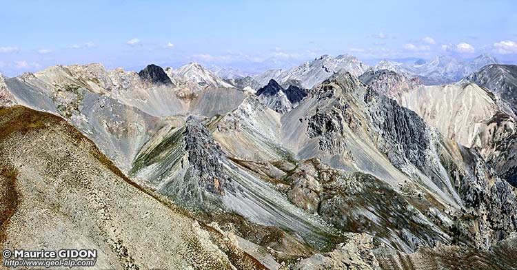 Enfin les parties plus basses et plus orientales des crêtes, à l'est de la cabane de la Gardère (vallon de Combe Bonne) et du confluent des ravins des Clapouses et des Fouranes, montrent au contraire des successions jurassico-crétacées qui affleurent assez largement. En outre il s'avère que ces couches reposent sur des dolomies du Trias supérieur (Norien), ce qui montre que l'on a affaire là au prolongement septentrional de la nappe de la Clapière. Enfin l'extrémité boisée de ces crêtes, qui domine directement la vallée de la Rivière d'Arvieux est entaillée dans les schistes lustrés piémontais qui affleurent autour de cette localité.