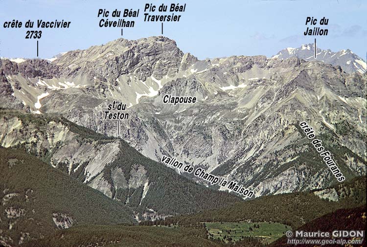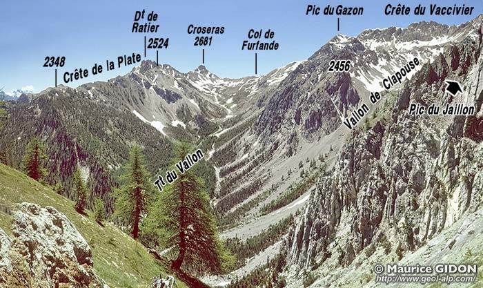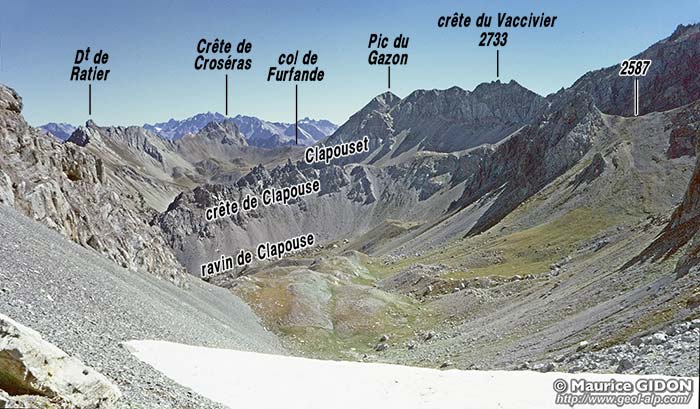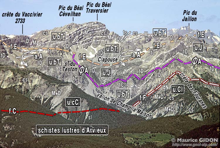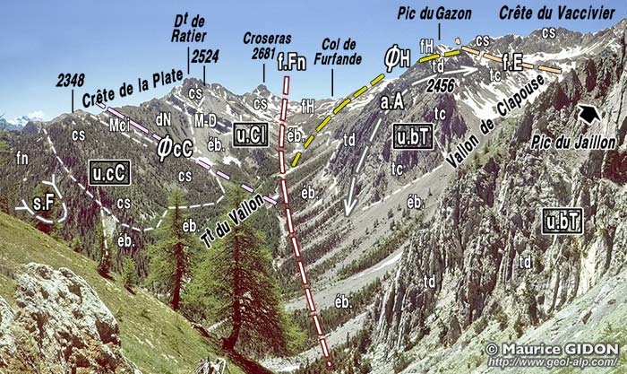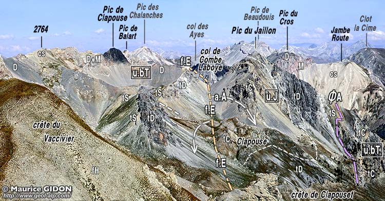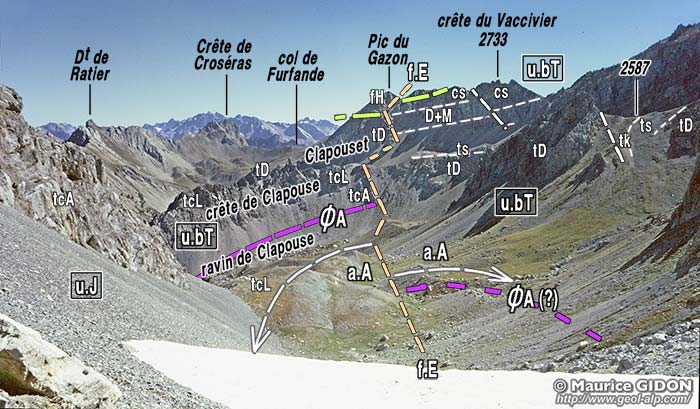 ![]() Le haut vallon de Clapouse vu du sud, depuis le sommet du Pic du Gazon de Furfande. a.A = anticlinal des Ayes ; f.E = faille de l'Échaillon de Clapeyto : elle suit à peu de chose près l'axe de l'anticliclinal des Ayes et en abaisse le flanc gauche (occidental) juxtaposant ainsi deux unité qui sont normalement superposées. u.bT = unité du Béal Traversier (nappe d'Assan) ; ØA = surface de chevauchement de la nappe d'Assan (en contrebas de la surface topographique du côté ouest de la faille) ; u.J = unité du Jaillon (nappe de la Font-Sancte) |
