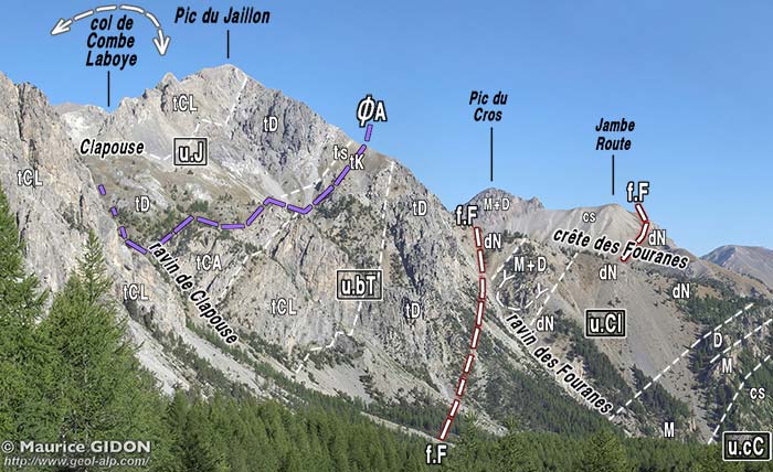 La coupe naturelle fournie par la crête des Fouranes montre très clairement que la faille des Fouranes, qui guide plus au sud le cours supérieur N-S du vallon du col de Furfande, sectionne les imbrications de la zone de Ceillac dont le pendage vers l'ouest est nettement inférieur à celui de la faille.