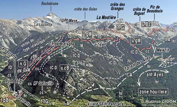 ![]() Le chaînon de la crête des Granges et la rive droite du vallon des Ayes, vus du nord depuis le sommet du Prorel n.G = nappe de la Crête des Granges (surface de chevauchement en brun-rouge pâle) ; u.gM = unité de la Grande Maye ; u.cB = unité de la Croix de Bretagne ; u.Bs = unité du Pic de Beaudouis = prolongement méridional de celle de la Grande Maye, au delà du décrochement (non nommé) qui passe à la brèche de la Moutière. f.rG = faille du Rocher Gafouille ; f.A = faille du vallon des Ayes ; on a interprété la surface tectonique qui sépare u.gM de u.cB, comme représentant le prolongement de la faille du Pont Baldy (f.pB, en rose) ; une interprétation alternative serait de considérer que ce prolongement est représenté par la faille des Ayes, mais cela ne s'accorde pas avec le rejet, apparemment sénestre, de la faille du rocher Gafouille. suite de cette vue vers la gauche à la page "Briançon" et vers la droite à la page "Mélézin" ; détails de l'arrière-plan droit à la page "Ayes". |