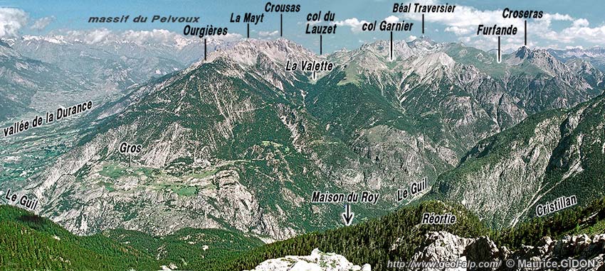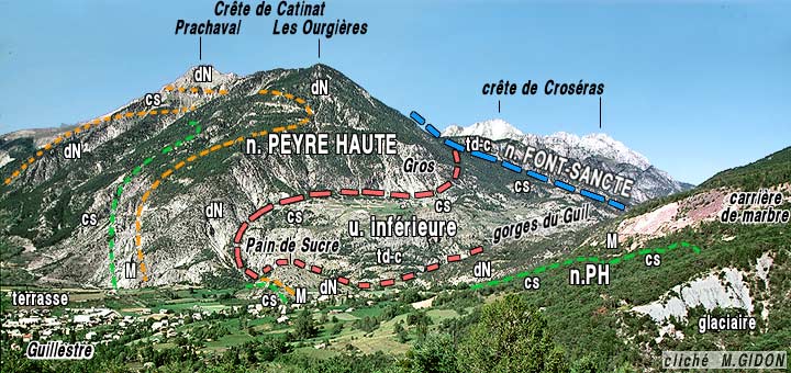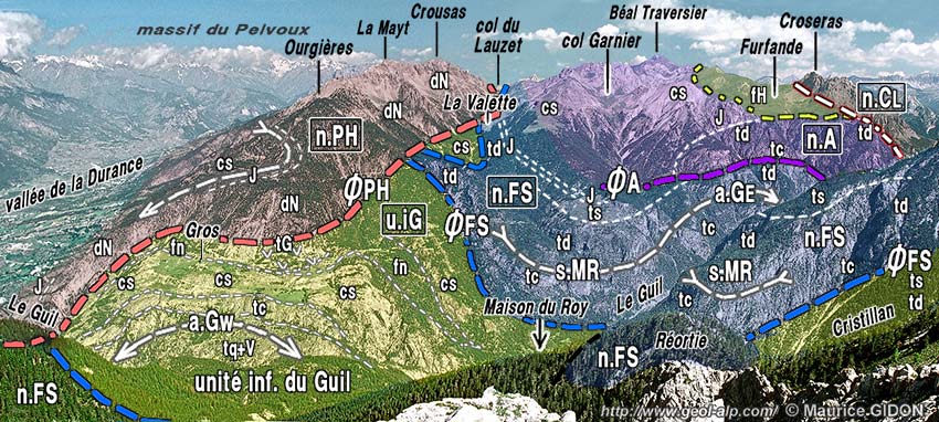 ![]() Les gorges du Guil et le massif de Peyre Haute vus du sud, depuis le sommet de Cugulet. a.Gw = anticlinal du Guil ouest (aval) ; s.MR = synclinal de La Maison du Roy ; a.GE = anticlinal est (amont) des gorges du Guil, UIG = unité inférieure du Guil ; n.PH, n.FS, n.A, n.CL = nappes de Peyre Haute, de la Font-Sancte, d'Assan et de la Clapière (Ø = surfaces de chevauchement respectives de ces nappes). Observer la position de la klippe de flysch à Helminthoïdes de Furfande, pincée entre les nappes d'Assan et de la Clapière. Concernant le vallon de la Valette (revers est de la crête Ourgières - Crousas) voir les détails à la page "crête de Catinat" ; concernant la partie la plus amont, ici masquée, voir les pages "Furfande" et "Croseras" . |