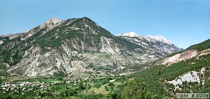 La vallée du Guil débouche de ses gorges aval dans la plaine de la Durance à Guillestre. Depuis les abords sud de cette localité et notamment depuis les premières pentes de la route du col de Vars on bénéficie de la vue sur la coupe naturelle des pentes de rive droite du débouché de ces gorges : celle-ci montre l'empilement de nappes calcaires briançonnaises ployées en une demi-voûte anticlinale dont le flanc ouest s'enfonce sous les flysch de l'Embrunais qui occupent synclinalement la vallée de la Durance entre Guillestre et Réotier.