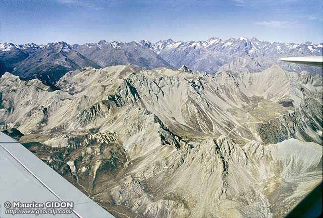 ![]() Les crêtes méridionales de la montagne de Peyre Eyraute, vues du sud-est, d'avion, de l'aplomb de Clapeyto. f.M = faille de Maravoise ; pour l'essentiel les terrains visibles sur ce cliché appartiennent à la nappe de Peyre Haute mais se répartissent entre les deux flancs du synclinal qui la replie : la crête de Maravoise - Roche Noire en représente le flanc inverse, alors que le flanc normal affleure du Pic du Haut Mouriare jusqu'au Pic de Peyre Eyraute. |