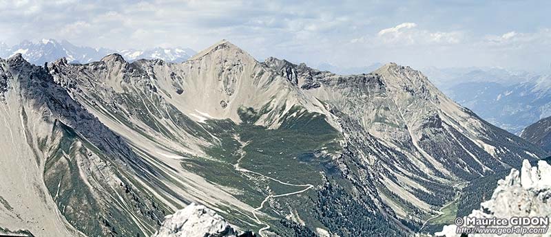 Sur les versants occidentaux le talus de ces "marbres en plaquettes" couronne une barrière de falaises formées par les dolomies litées du Norien (Trias supérieur). Le contact entre ces deux terrains est en général bien visible car souligné par une falaise d'une petite centaine de mètres de haut, courant à flanc de pentes, qui est formée par les calcaires du Dogger et/ou du Malm (à faciès "marbre de Guillestre").