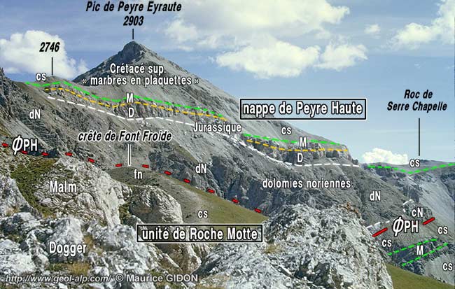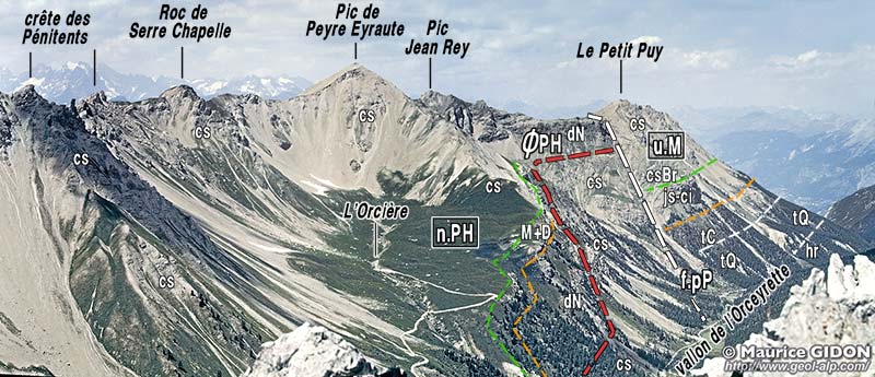 ![]() Le versant occidental de la crête nord de Peyre Eyraute, vu par dessus la crête du Testas, depuis le pentes à l'est du col de La Pousterle (Puy Saint-Vincent). n.PH = nappe de Peyre Haute (ØPH = sa surface de chevauchement) ; u.rM = unité de Roche Motte ; f.O = faille NNE-SSW des Oriols. En avant plan les deux échines boisées sont formées par les quartzites triasiques des deux flancs du synclinal de Roche Baron. |