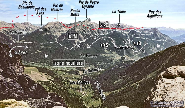 ![]() La vallée de la Durance et le massif de Peyre Eyraute, vus du nord depuis le Rocher Blanc de Serre Chevalier. Les terrains de la zone houillère sont affectés de plis qui n'affectent guère la couverture "carbonatée", quant à elle formée de nappes imbriquées et/ou superposées : u.rM = unités à Trias moyen (principalement unité de Roche Motte) ; u.pH = unités à Trias supérieur (nappe de Peyre Haute) a.Ayes = anticlinal des Ayes (fortement déversé vers l'est) ; a.sS = anticlinal du vallon de Saint-Sébastien ; s.rB = synclinal de Roche Baron (ces deux derniers plis déversés vers l'ouest). pour une analyse plus détailée de ce panorama voir les pages "Mélezin" et "Oriols". |