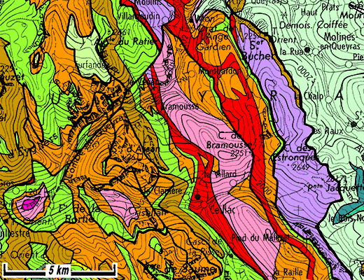 Cette terminaison se place dans le prolongement cartographique (voir en fin de page) de la faille décrochante NE-SW du Guil et semble en bon accord avec le jeu en décrochement dextre que montre cet accident plus au SW (voir la page "Croseras") ; en effet on retrouve aux Escoyères, 700 m plus au SW sur le coté sud-oriental de ce tracé, une mince bande de ces schistes lustrés qui est prise entre les cargneules qui y jalonnent le tracé de la faille de Ceillac. |