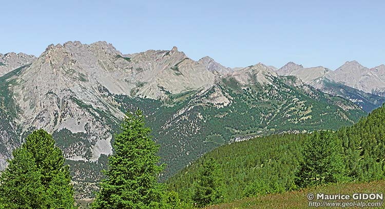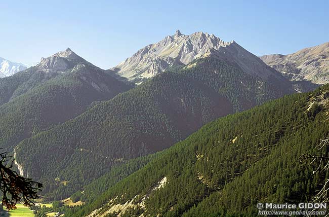 Les pentes orientales du massif de Peyre Eyraute (rive droite de la vallée d'Arvieux), vues de l'est depuis le hameau de Peynin, au dessus d'Aiguilles. |