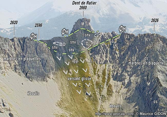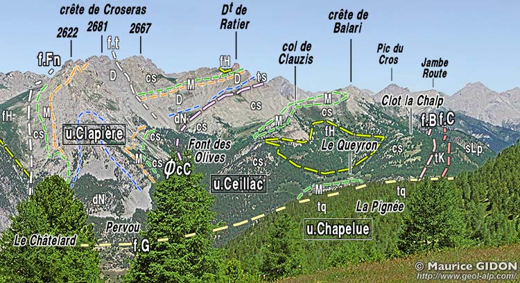 Enfin ces "marbres en plaquettes" forment les deux versant des vallons qui s'élèvent, au nord comme au sud, jusqu'au col de Clauzis et c'est par une surface de chevauchementque la succession de la Dent de Ratier repose sur ces derniers dans le versant est de ses escarpements sommitaux : il faut vraisemblablement l'interpréter comme le chevauchement initial des écailles de Ceillac sur la nappe de la Clapière mais qui a subi là le renversement vers l'est qui est courant dans toutes les pentes à l'ouest d'Arvieux.