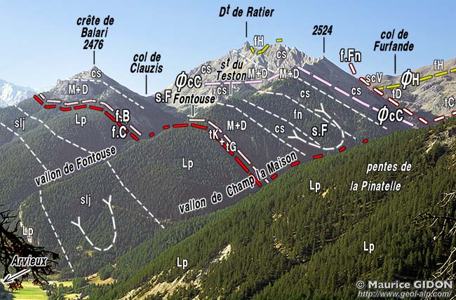 Le versant de la montagne de Ratier qui regarde vers la vallée d'Arvieux est entaillé par les vallons de Fontouse et surtout de celui de Champ-la-Maison. Ils recoupent bien les prolongements des éléments structuraux observés ci-dessus en versant sud, mais, ils n'offrent que des pentes boisées, car exposées à l'Ubac, où l'analyse des détails de la géométrie structurale n'est guère possible.